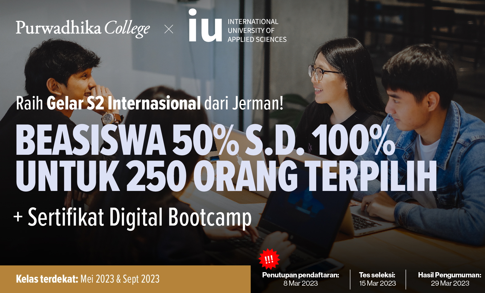 Purwadhika College dan International University of Applied Sciences membuka kesempatan beasiswa mulai dari 50% hingga 100% untuk mengikuti program Postgraduate Degree dari Jerman di International University of Applied Sciences. Penerima beasiswa juga akan mendapatkan Digital Bootcamp Certificate dari Purwadhika Digital Technology School dengan fasilitas career support seumur hidup ke lebih dari 1000 hiring partner Purwadhika.